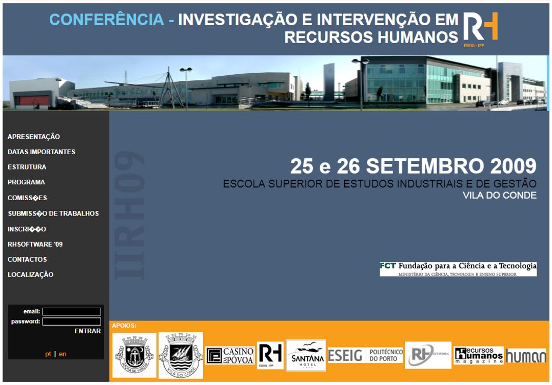 WEB: http://www.eseig.ipp.pt/eventos/conferencias/conferencia-iirh09/A Conferência Investigação e Intervenção em Recursos Humanos: Dos modelos teóricos às boas práticas profissionais, a realizar no dia 25 e 26 de Setembro de 2009 na ESEIG/IPP, é um convite para a construção de respostas às diferentes problemáticas de Recursos Humanos colocadas a todos os que trabalham com pessoas. Repensar a gestão e o desenvolvimento das pessoas no contexto amplo e exigente da sociedade de risco que enquadra o actual paradigma económico-social é um desafio para aqueles, cuja actividade profissional se centra neste objectivo, seja no papel de gestor, de técnico, de consultor, académico ou educador.