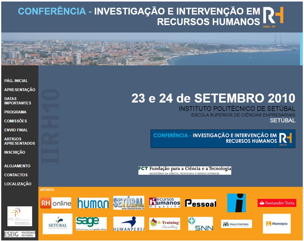 WEB: http://www.iirh4.esce.ips.pt/Resultado de uma parceria entre os Institutos Politécnicos de Setúbal através da ESCE e do Porto através da ESEIG, esta 4ª edição da Conferência IIRH pretende dar continuidade às edições anteriores, realizadas em Vila do Conde e em Setúbal, enquanto espaço de debate e partilha de experiências em torno da problemática da Gestão de Recursos Humanos tendo em conta as diferentes áreas de investigação e de intervenção profissional que constituem esta área do saber.